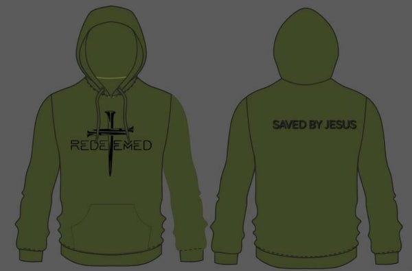 Heavy Cotton Performance Hoodie. Redeemed 3 Nail Cross on the front. Saved By Jesus on the Back. Olive with Orange a